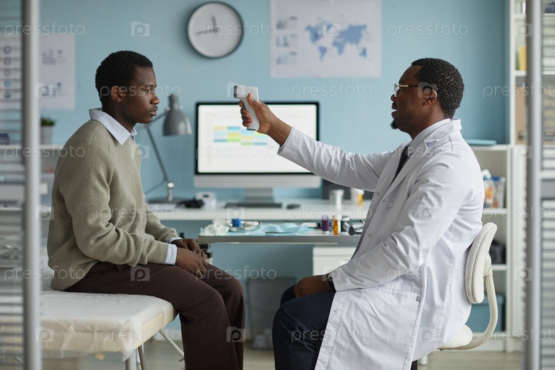 Чернокожий доктор среднего возраста измеряет температуру молодого взрослого черного человека