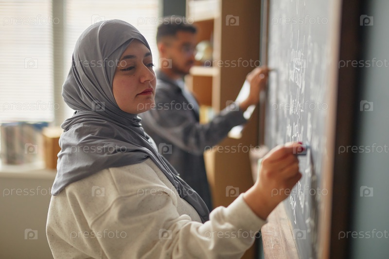 Молодая взрослая женщина с Ближнего Востока пишет на доске в классе языков