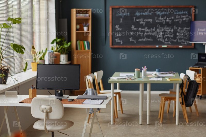 Пустой класс показывает языковую школу рабочее пространство и учебные материалы