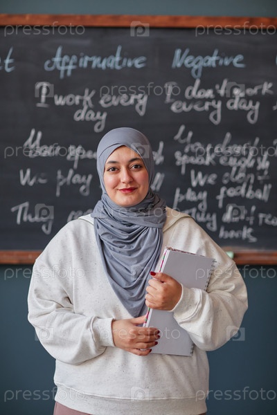 Портрет молодой взрослой женщины с Ближнего Востока, держащей блокнот в языковой школе