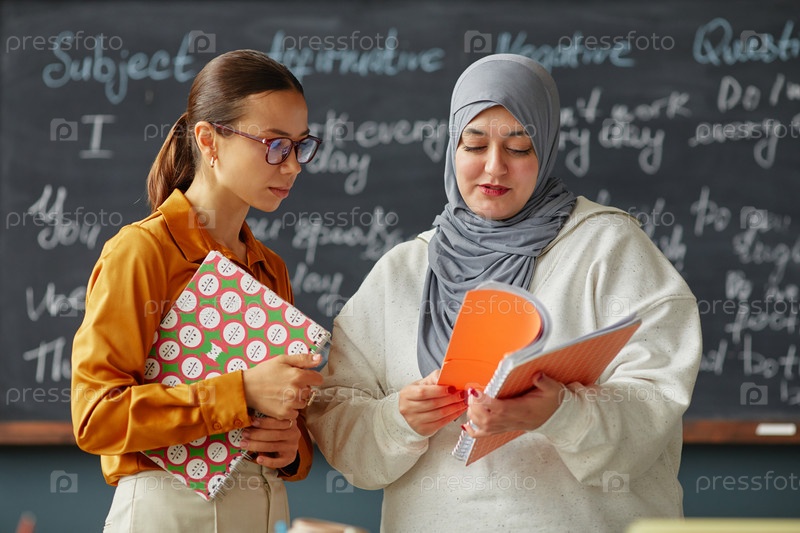 Учительница английского языка и женщина с Ближнего Востока просматривают тетради в классе