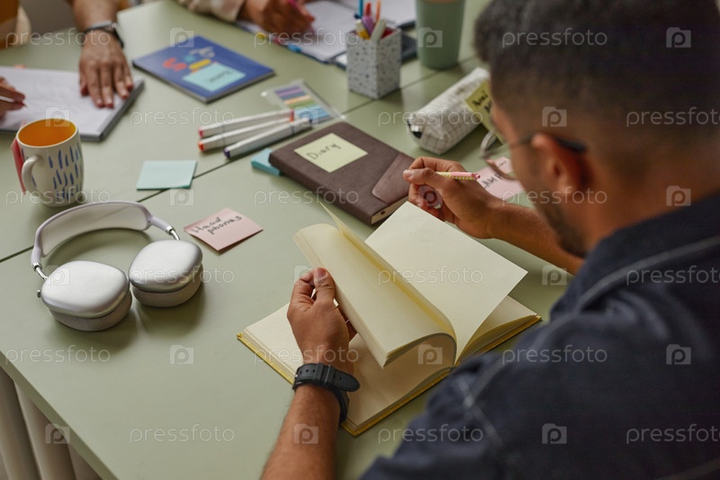 Молодой взрослый мультиэтнический мужчина изучает языковые материалы на школьном столе