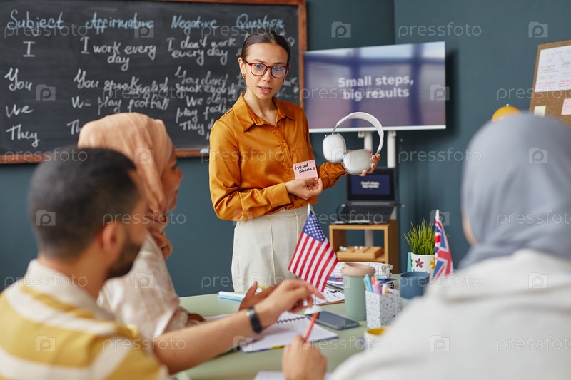 Молодая женщина преподает мультиэтническим взрослым английский язык в классе