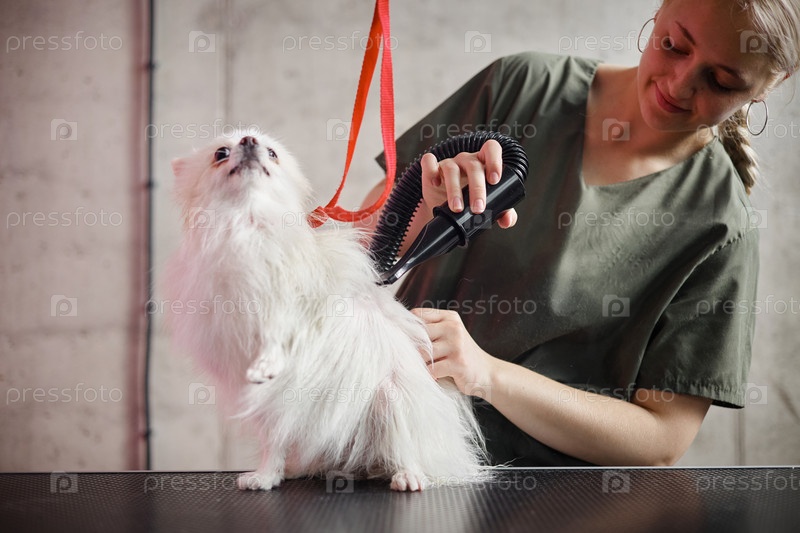 Молодая женщина ухаживает за маленькой собакой с профессиональным сушилкой