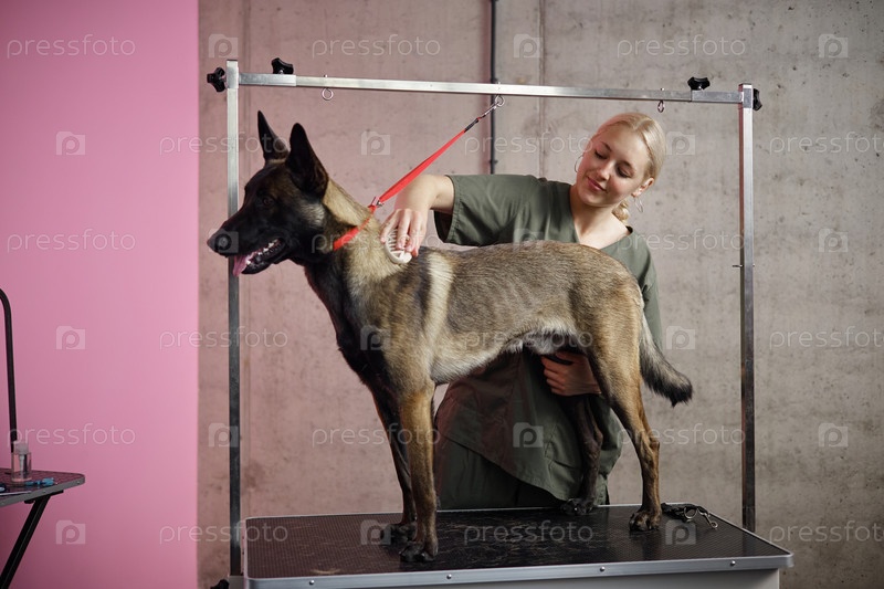 Молодая женщина ухаживает за бельгийским малиноисской собакой в профессиональной обстановке