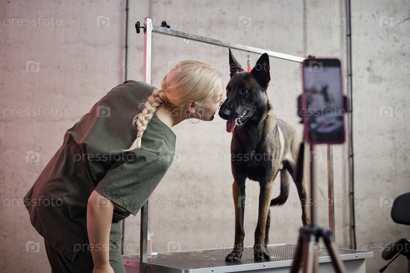 Молодая взрослая женщина ласково взаимодействует с бельгийской овчаркой