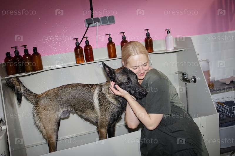 Молодая взрослая цикасианская женщина обнимает мокрую собаку купается в салоне красоты
