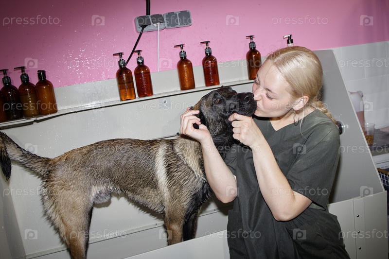 Молодая женщина купается и целует мокрого пса в салоне красоты