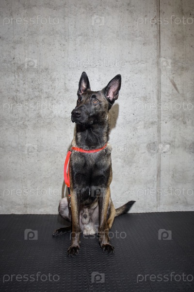 Бельгийский мальinois собака сидит в помещении, носящий воротник против бетонной стены