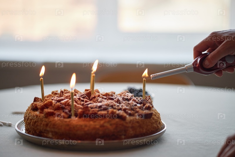 Зажигание рождественских свечей на торте во время празднования Рукой в помещении