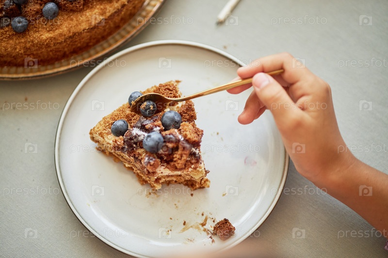 Употребление в пищу сливочного торта с ложкой за столом Child
