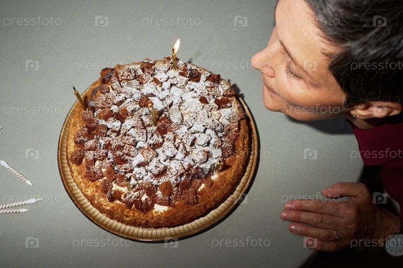 Старшая женщина дует в свечу на день рождения Торт празднует день рождения
