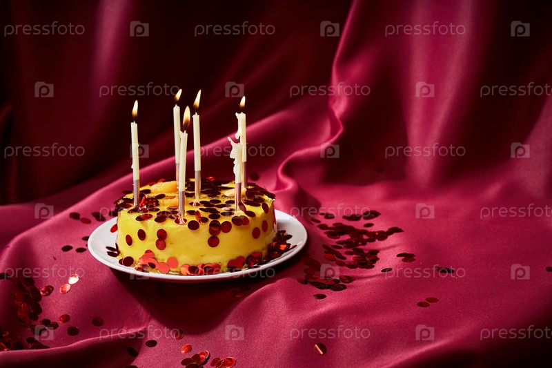 Торт на день рождения с горящими свечами, стоящий на тарелке в окружении конфетти