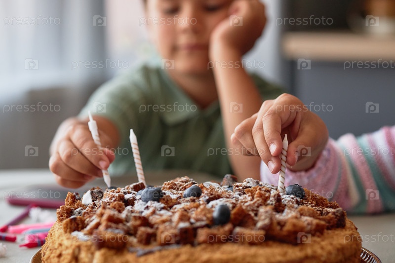 Два ребенка украшают торт свечами во время празднования дня рождения в помещении