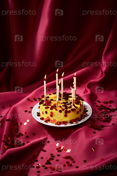Круглый торт с горящими свечами и конфетти на красной атласной ткани