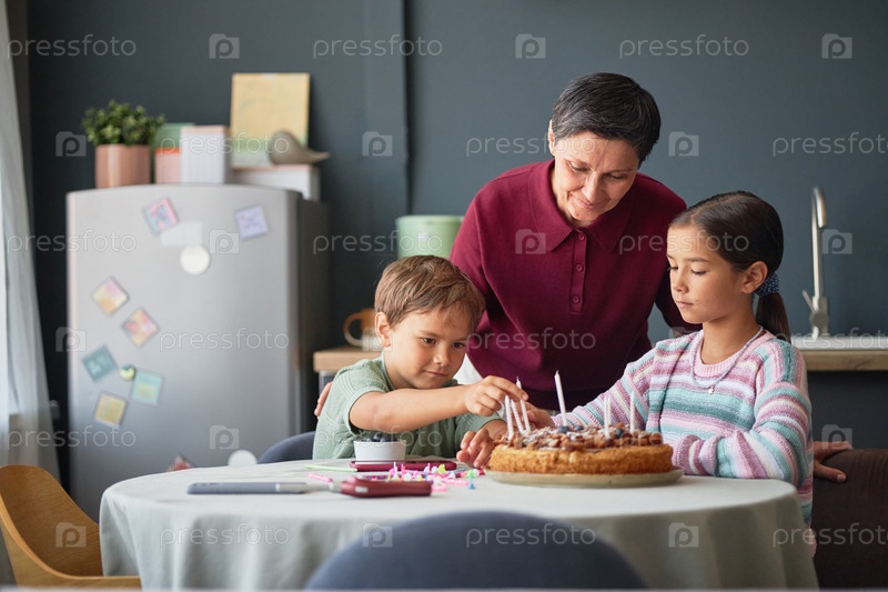 Пожилая женщина помогает детям украшать рождественский торт дома