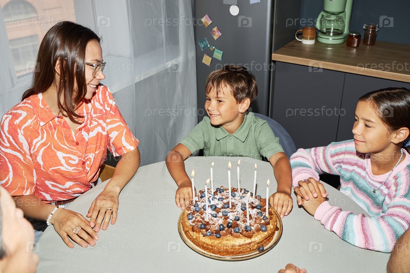 Женщина празднует день рождения с улыбающимися детьми вокруг торта