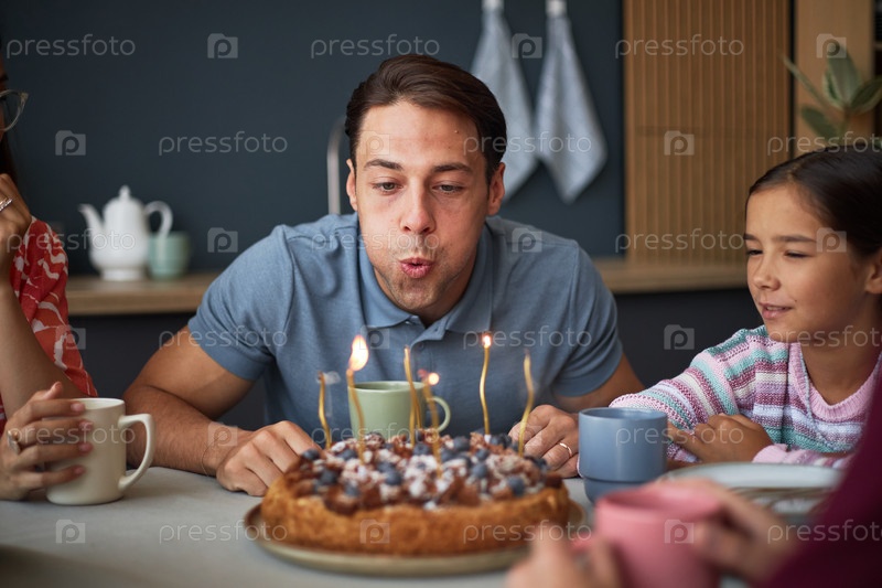 Молодой человек дует в рождественские свечи, окруженный членами семьи