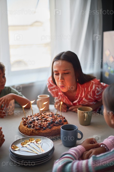 Молодая женщина дует в рождественские свечи, окруженная детьми