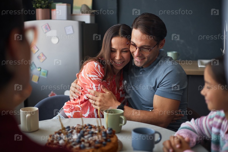 Молодая пара обнимается во время празднования дня рождения с семьей в помещении