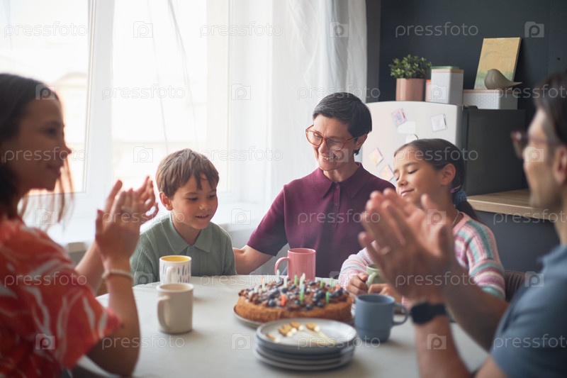 Многонациональная семья празднует день рождения с детьми вокруг торта за столом