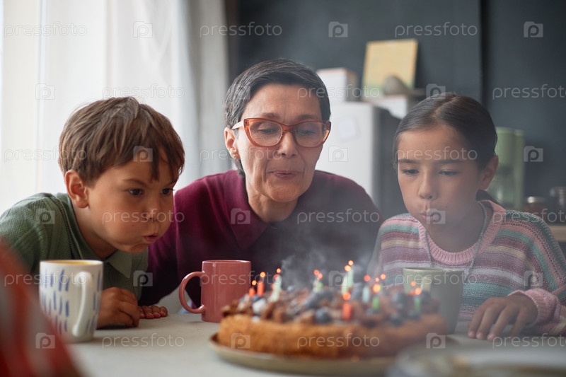 Пожилая женщина и двое детей дуют в свечи на рождественском торте