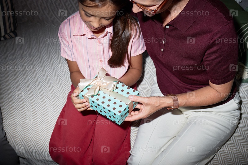Женщина среднего возраста дарит упакованную коробку для подарков улыбающейся девочке