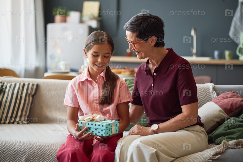 Пожилая женщина дарит подарочный ящик улыбающейся девочке-подростку в помещении
