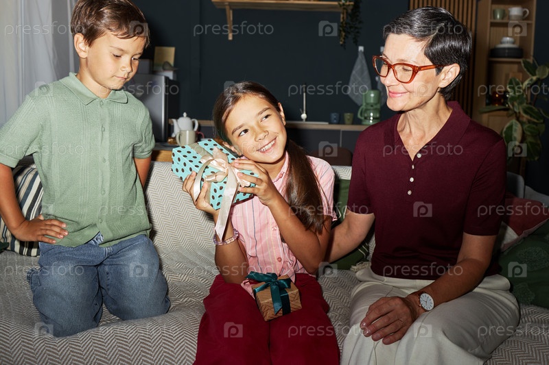 Пожилая женщина, улыбающаяся с двумя детьми, дарит подарки на день рождения