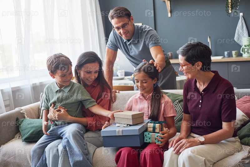 Семья собирается вокруг гостиной, давая подарки молодой девушке