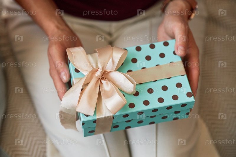 Взрослая женщина держит подарочную коробку с лентой, сидя в помещении