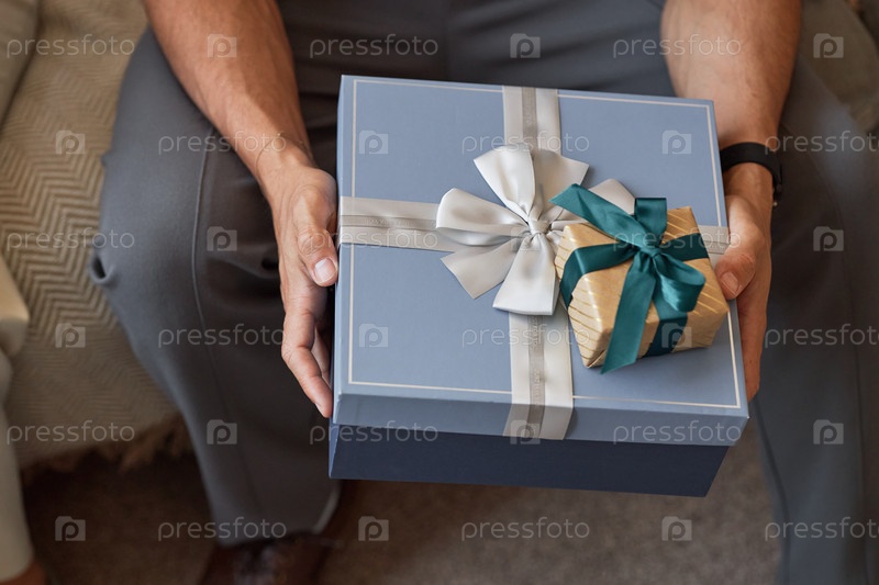 Мужчина среднего возраста держит коробки с подарками, сидя в помещении