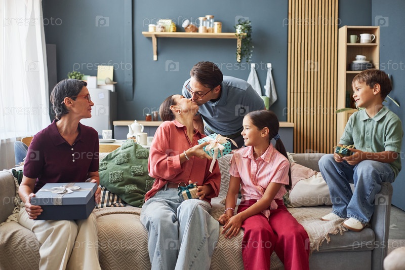 Семья празднует день рождения с даром подарков и любовью дома