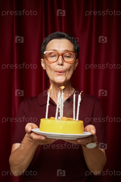 Женщина среднего возраста дует в свечи на рождественский торт внутри дома