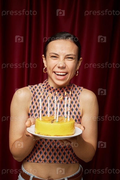 Портрет молодой взрослой женщины, улыбающейся в то время как она держит день рождения пирог