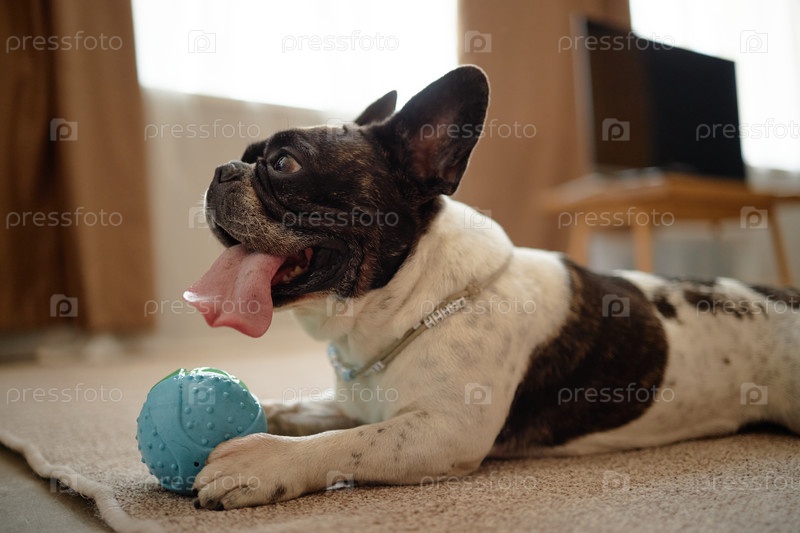 Французский бульдог лежит в помещении, играя с синим резиновым мячом на ковре
