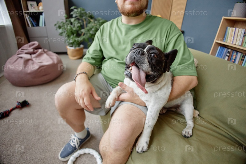 Молодой взрослый мужчина сидит в помещении, лаская французского бульдога на диване