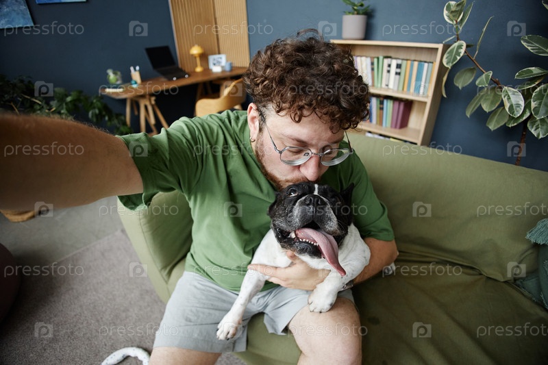 Молодой взрослый мужчина обнимает французского бульдога, делая селфи в помещении
