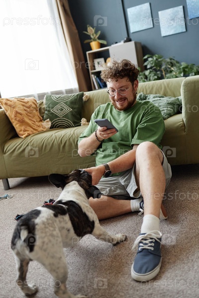 Молодой человек, сидящий на полу и улыбающийся во время игры с собакой в помещении