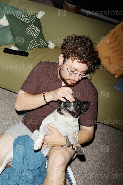 Молодой взрослый мужчина ласкает французского бульдога, сидя в помещении