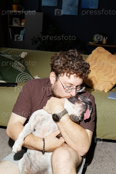 Молодой взрослый мужчина обнимает французского булдога, сидя в помещении