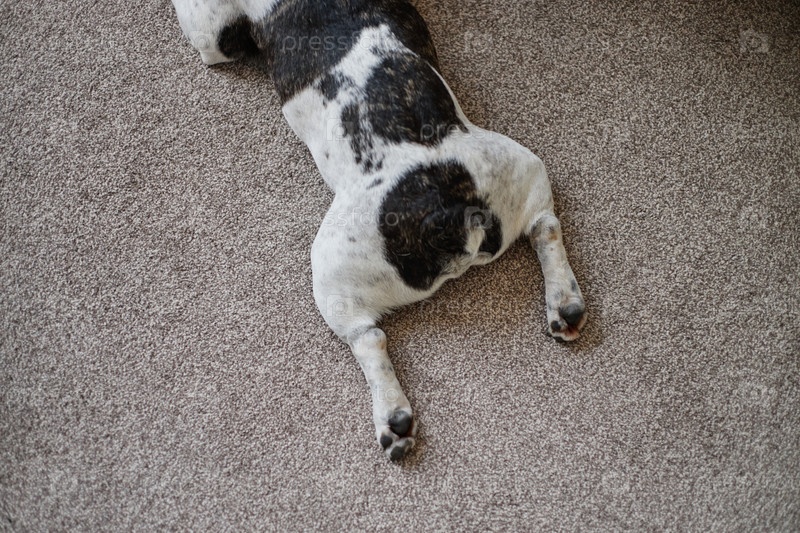 Бульдог лежит на французском ковре отдыхая в помещении в удобном положении