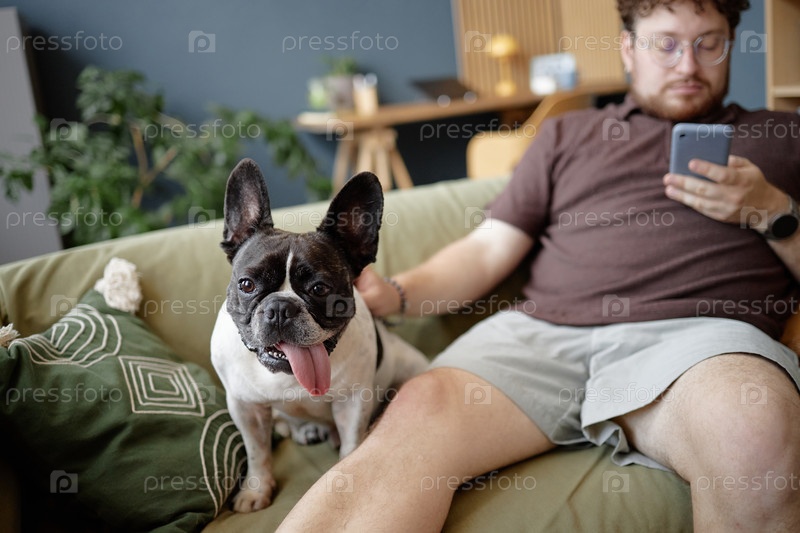 Молодой взрослый мужчина использует смартфон, пока ласкает французского бульдога в помещении