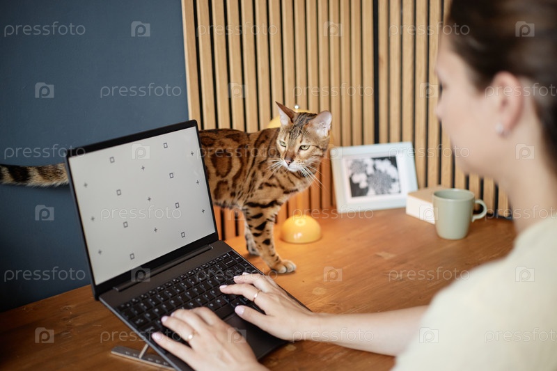 Молодая женщина работает на ноутбуке с бенгальским котом, стоящим за рабочим столом