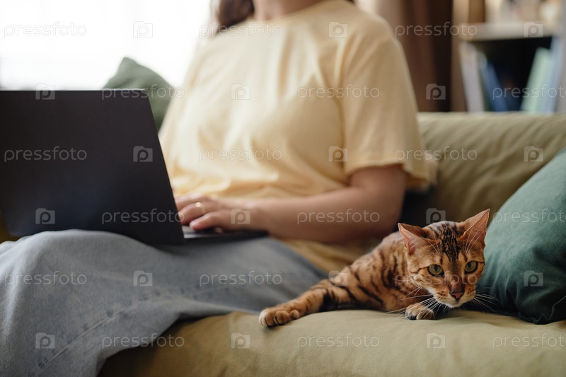 Молодая взрослая женщина использует ноутбук, сидя рядом с бенгальской кошкой
