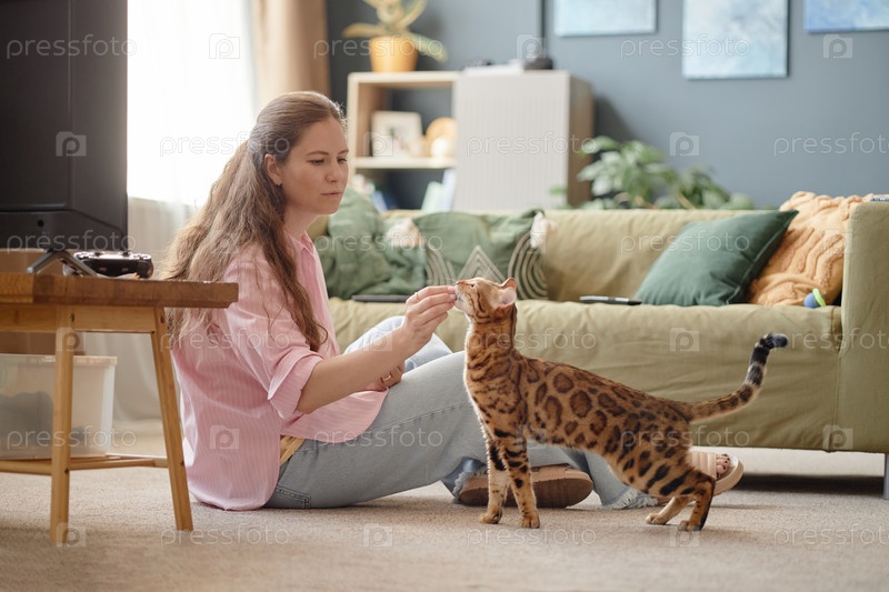 Молодая женщина сидит на полу, кормит бенгальскую кошку в помещении