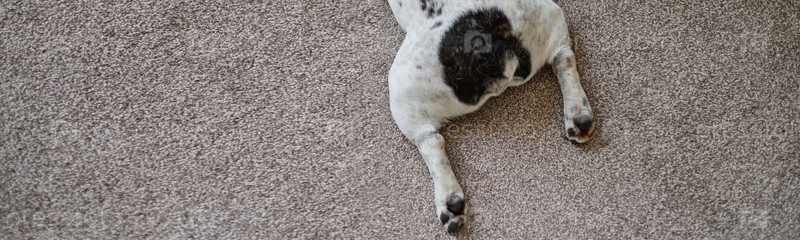 Заголовок французского булдога, лежащего на ковре и отдыхающего в помещении с вытянутыми ногами