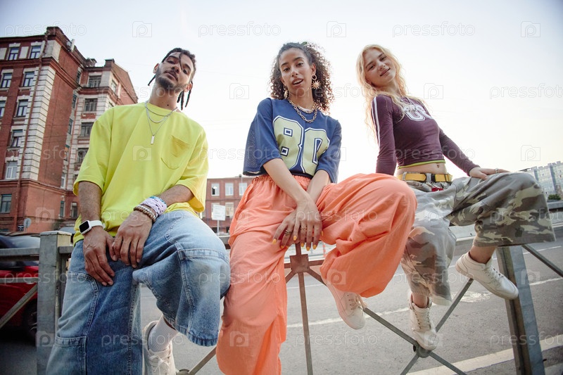 Различные друзья поколения Z позируют конфиденциально на улице в городской среде