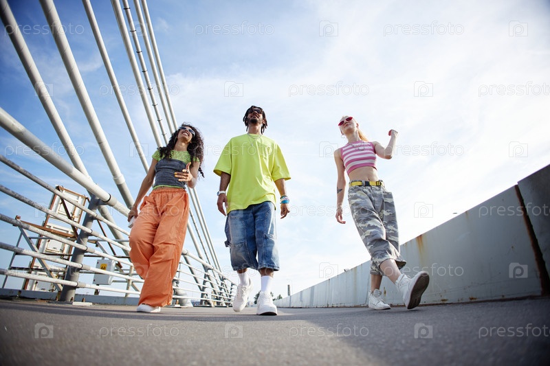 Мультиэтнические люди из поколения Z ходят на улице и наслаждаются городским образом жизни