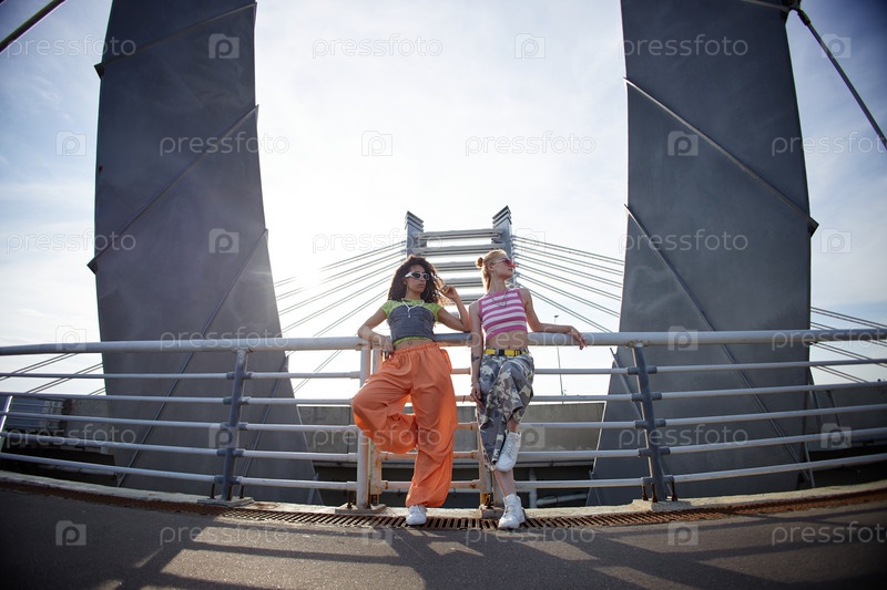 Две девушки из поколения Z отдыхают на городском мосту в ярком дневном свете